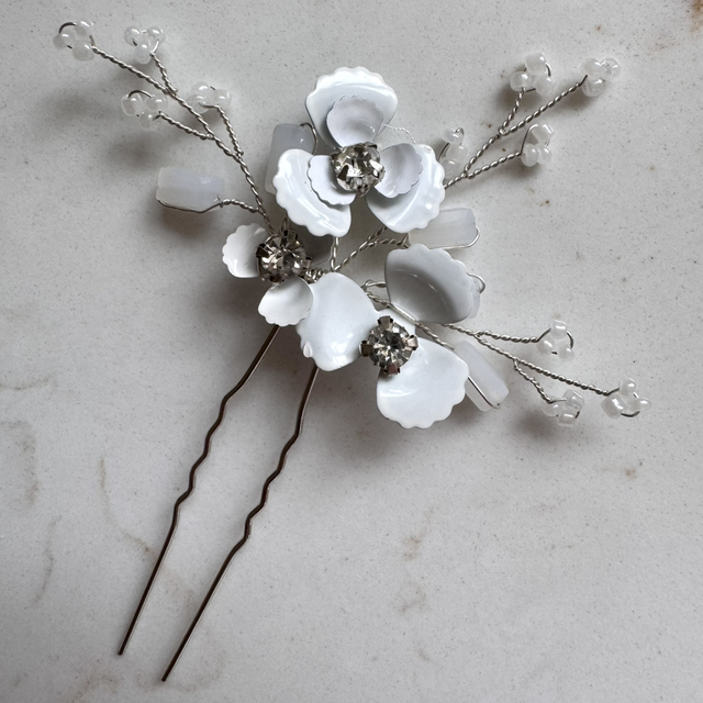 3 silver toned hair pins, with white enamel flowers and delicate pearl and diamanté details.