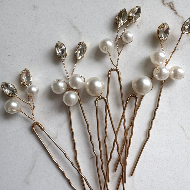 6 gold toned hair pins, 4 with diamanté and pearl details, and 2 with single pearls. Elevate your bridal hair style with these beautiful eye catching pins. Individual pins are versatile, having the flexibility to place them precisely where you want them!